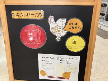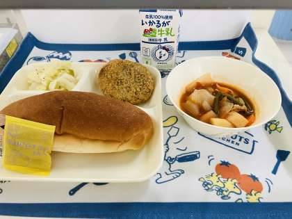 今日の献立は「チキンレバーカツ、ケチャップ煮、キャベツのバジル風味サラダ、コッペパン、アプリコットジャム、牛乳」でした。チキンレバーカツには、鶏のレバーが入っています。カレー味にしているので、食べやすくなっています。