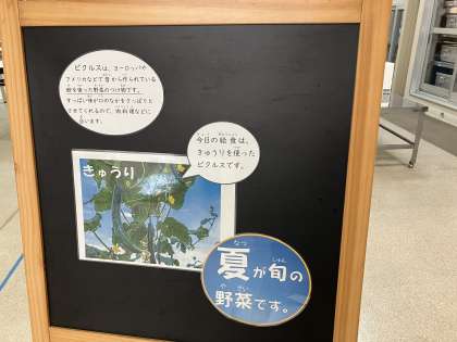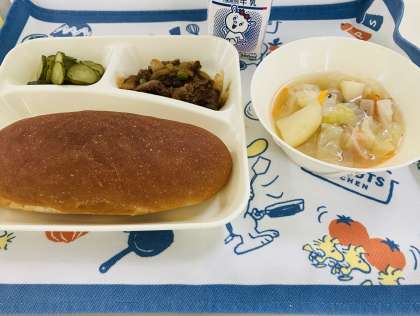 今日の献立は「牛肉のソース煮、スープ、きゅうりのピクルス、黒糖パン、牛乳」でした。ピクルスは、酢を使った野菜のつけ物で、今から4000年ほど前から作られていたといわれています。
