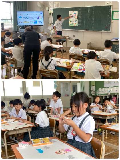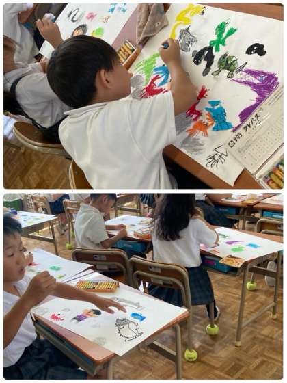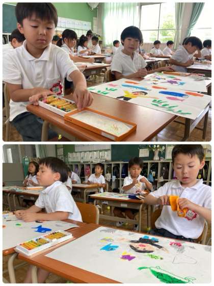 1年生は、絵の中で川の生き物と友達になろうということで取り組みました。魚だけでなく、ザリガニやカメ、カニなどの水生生物もたくさん描くことができました。これから、絵の具で背景をぬっていきます。完成が楽しみです。