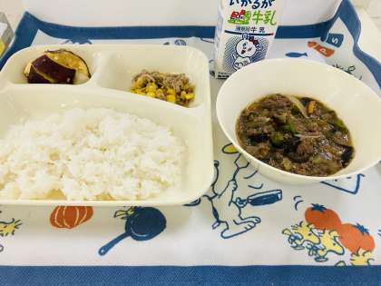 今日の献立は「マーボーなす、ツナと野菜のいためもの、焼きさつまいもの甘みつかけ、ごはん、牛乳」でした。なすは、夏から秋が旬(たくさんとれておいしい時期)の野菜です。今では、ハウス栽培により、一年中食べることができます。