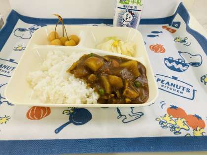 今日の献立は「チキンカレーライス、キャベツとコーンのサラダ、さくらんぼ(缶づめ)、牛乳」でした。