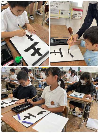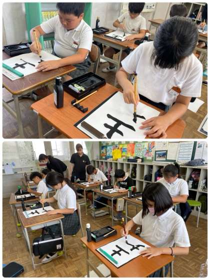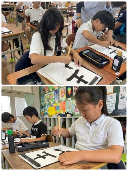 4年生は、書道で「土地」の字を書きました。正しい姿勢で、とめ、はね、はらいに気をつけながら、集中してじっくりと書きました。