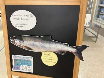 【鮭の遡上:さけのそじょう】さけは、川で生まれ、海で成長し、卵を産むために、また生まれた川へ帰ってきます。