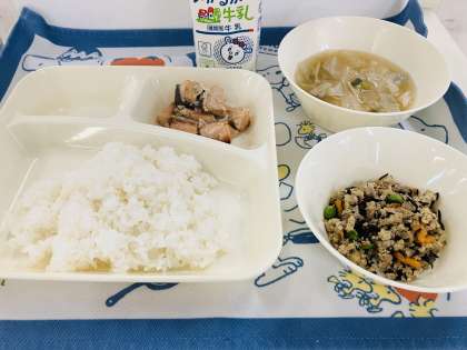 今日の献立は「さけのつけ焼き、五目汁、高野どうふのいり煮、ごはん、牛乳」でした。さけは、たんぱく質を多く含む赤の食べ物のなかまです。さけの身には、たんぱく質のほかにビタミンB1、ビタミンB2、ビタミンDが含まれています。また、さけの脂肪には、DHAやEPAという成分が多く含まれていて、血液の流れをよくするはたらきがあります。