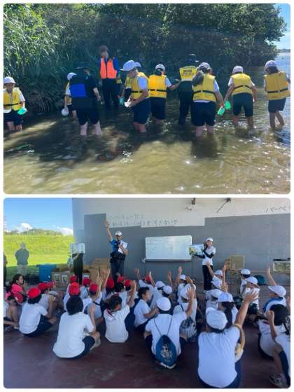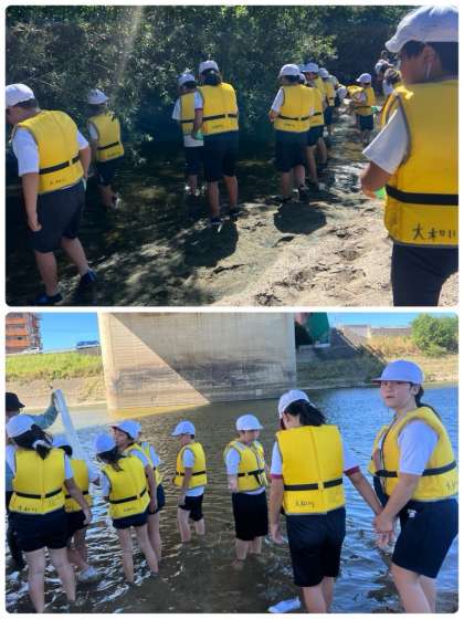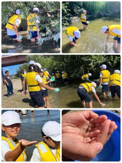 4・5年生が、行基大橋の下で、大和川水生生物調査にのぞみました。1984年から、全国の一級河川で毎年実施されている水質調査です。大和川がどんな川で、どんな水生生物が生息しているのかを調べ、環境学習を深めることができました。クラスで協力して、投網を体験させてもらうこともでき、貴重な経験となりました。