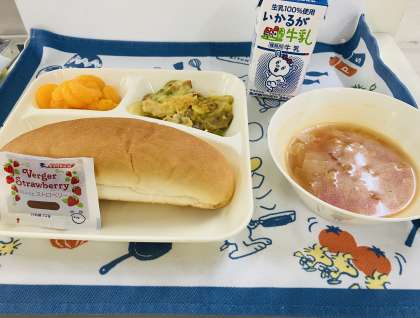 9/27の献立は「カレーマカロニグラタン、トマトスープ、みかん(かんづめ)、コッペパン、いちごジャム、牛乳」でした。