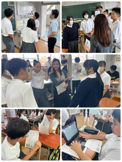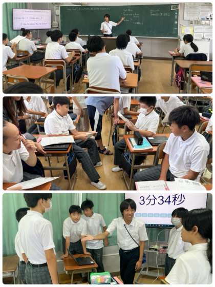 この日は、自分の好きな人物やキャラクターを紹介し合いました。三人称単数現在形の文の意味を理解しながら、活発に交流することができました。教員と生徒一人ひとりが、英語でやり取りする時間を、できるだけたくさん確保できるように、今後も工夫しながら学習を進めていきたいと思っております。
