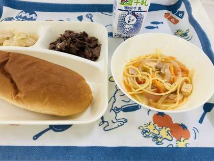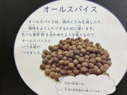 今日の献立は「牛肉の香味焼き、トマトのスープスパゲッティ、キャベツのサワーソテー、黒糖パン、牛乳」でした。オールスパイスは、肉のくさみを消したり、風味をよくしたりするために使います。色々な香辛料を合わせたような香りなので、オールスパイスという名前がつきました。今日は、牛肉の香味焼きに使いました。