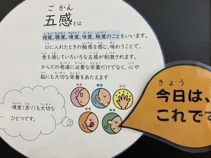 視覚、聴覚、嗅覚、味覚、触覚のことをいいます。口に入れたときの触感を感じ、味わうことで、食を通していろいろな五感が刺激されます。 からだの発達に必要な栄養だけでなく、心や脳にも大切な栄養をあたえます。