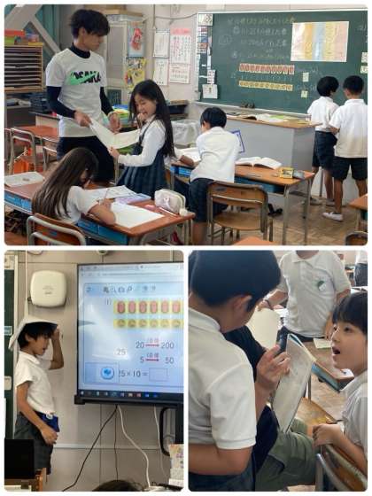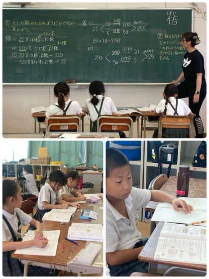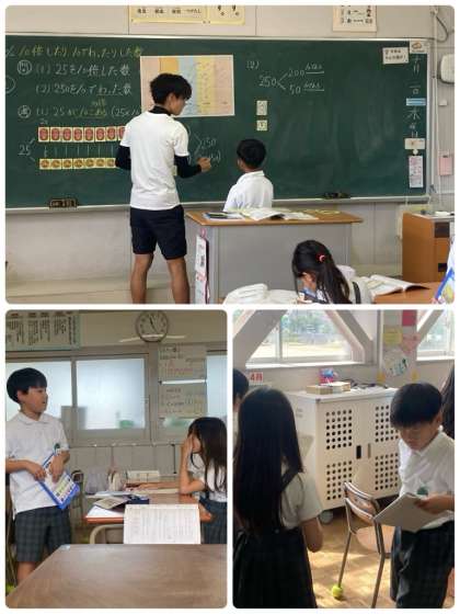3年生は、担任と副担任で学級を2分割して算数の授業にのぞんでいます。もとの数から変化していく流れを、位取り表や具体物を使いながら解いていきました。少ない人数で、個に応じた指導と、協働的に学ぶ場面のバランスを考えて、担任と副担任で授業をつくっています。