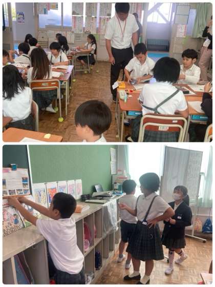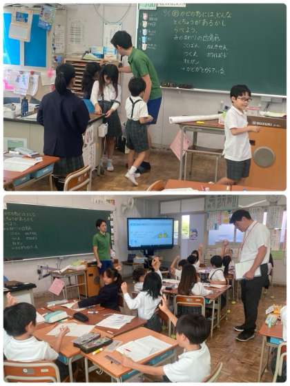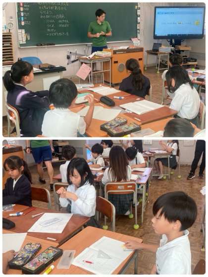 2年生は算数で、「かどの形」にはどんな特徴があるかを調べました。紙を折って「かどの形」を作り、直角という言葉を知りました。作った「かどの形」を教室内の様々な場所にあて、直角がたくさんあることを確かめました。