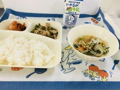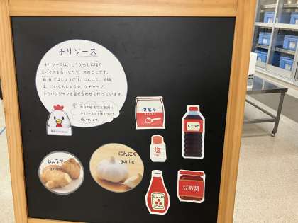 今日の献立は「鶏肉のチリソース焼き、焼き豚のスープ、ツナとさんどまめのオイスターソースいため、ごはん、牛乳」でした。チリソースは、とうがらしに塩やスパイスを合わせたソースのことです。