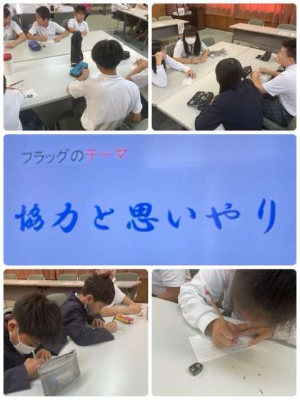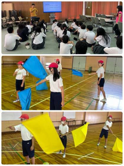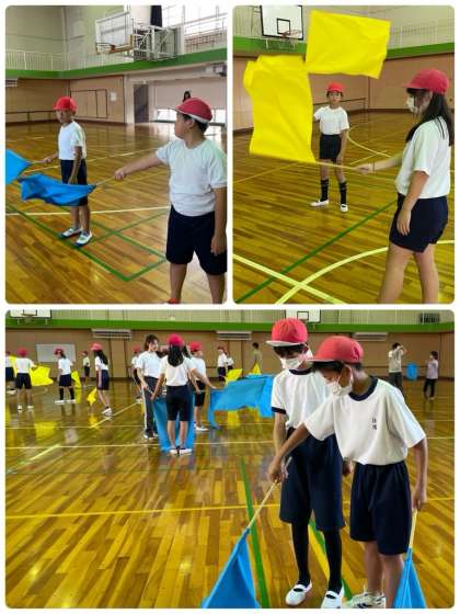 5・6年生の団体演技は、フラッグを使用します。今回の取り組みのテーマは「協力と思いやり」です。最初のオリエンテーションでは、各自が目標をたてました。毎時間ふり返りシートに記入し、冷静に自分の現状を見つめながら、次につなげられるように取り組んでいます。
