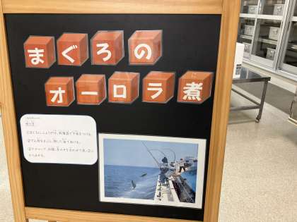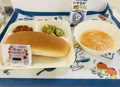 今日の献立は「まぐろのオーロラ煮、スープ、きゅうりとコーンのサラダ、コッペパン、いちごジャム、牛乳」でした。まぐろには、主に体の組織をつくるもとになるたんぱく質が多く含まれています。