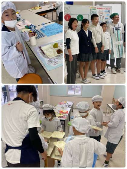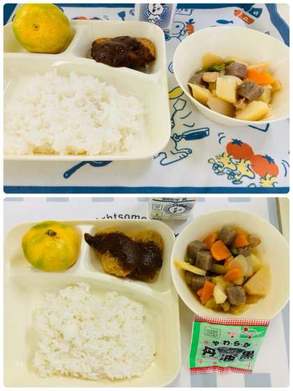 今日の献立は「みそカツ、じゃがいもと野菜の煮もの、みかん、中学校:ソフト黒豆、ごはん、牛乳」でした。みそは、蒸した大豆にこうじ(原料に菌をつけて増やしたもの)と塩を加えて発酵(細菌などの働きで、物の性質が変わること)させたものです。