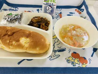 今日の献立は「なすのミートグラタン、鶏肉とキャベツのスープ、ミニフィッシュ、おさつパン、牛乳」でした。