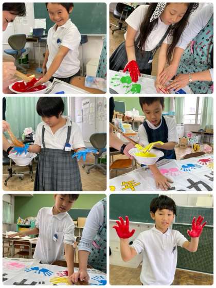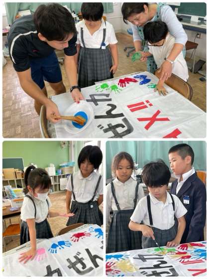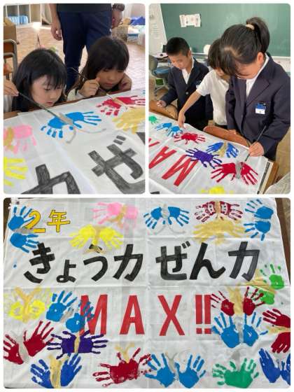 今年度の体育祭は、1〜9年の全クラスで学級旗を制作しています。本日は、2年生の作成の様子を紹介します。学級目標の周りに、みんなの手形を押し、金と銀で彩色して蝶ができ上がりました。