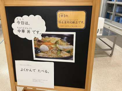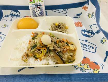 今日の献立は、「中華丼、もやしとコーンのごまいため、黄桃(かんづめ)、牛乳」でした。「中華丼」は卵の除去食対応献立です。