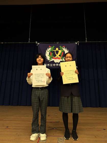10月5日(土)、大阪市長杯中学生英語暗唱大会が本校で開催されました。本校から7年生の男子1名、8年生の女子1名が出場し、壇上で3分間英語の文章を暗唱しました。夏から一生懸命に練習してきた努力が実り、見事「大阪市立中学校文化連盟会長賞」を受賞することができました!