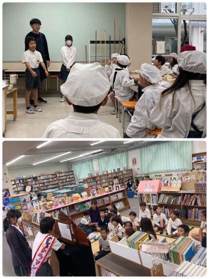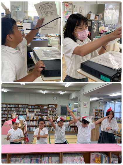 小学部の図書委員会で「としょトラマン」と題した読書啓発隊を結成して活動しています。今月は、昼休みの図書室開放の時間に紙芝居をしました。まず、全校放送やランチルームでの給食時に告知をして、少しでも多くの人に図書室に来てもらおうと呼びかけました。