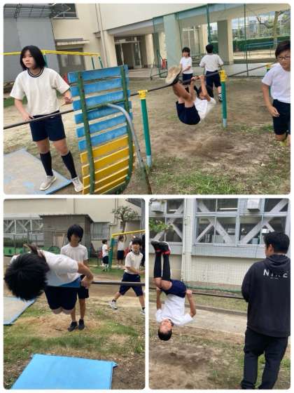 5年生は体育で、鉄棒とうんていの様々な技に挑戦中です。高学年ならではの、ダイナミックな回転で、大技を決めている子もいます。
