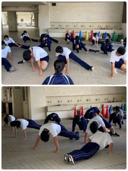 8年生は体育で、準備運動をしっかりしてから活動にのぞんでいます。体幹を鍛える意味でも、トレーニングをしながら様々な活動に入っていけたらと思います。