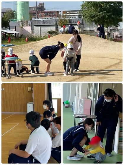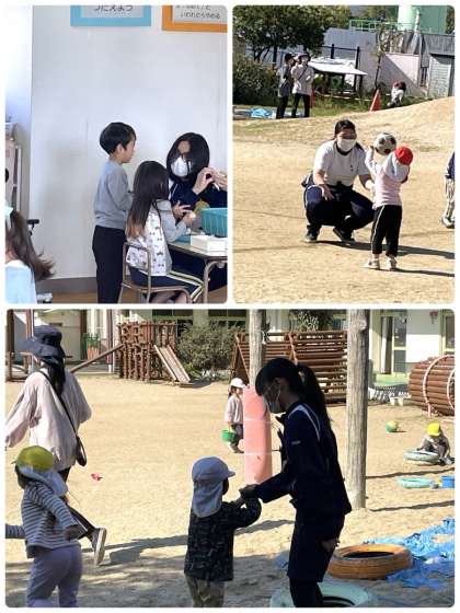 目線を合わせて話すことを心がけていたり、一緒になってだるまさんがころんだや、粘土遊びなどをしたりして、幼児たちの心をしっかりつかんだ様子でした。約1時間の短い時間でしたが、充実した実習になりました。別れ際には、お互いに名残を惜しんでいました。