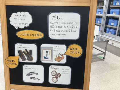 異なる材料でとっただしを合わせると、一種類だけのときよりもうま味が強くなります。給食室には、おだしのよいかおりが広がっていました。