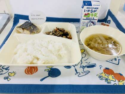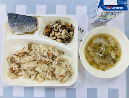 今日の献立は「さごしのごまじょうゆかけ、すまし汁、大豆の煮もの、小学校:ごはん、中学校:かやくごはん、牛乳」でした。今日のすまし汁と大豆の煮ものは、「だしこんぶ」と「けずりぶし」でだしをとっていました。