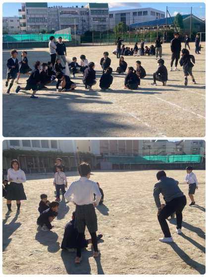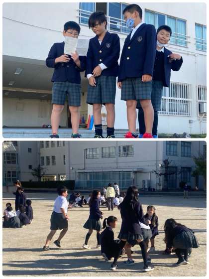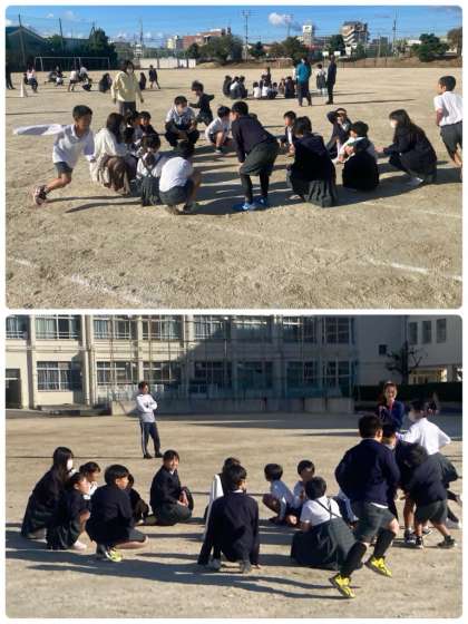 毎週木曜日、たてわり班で仲良く交流している集会の様子です。この日は、円になってしゃがみ、追いかけながら周っていく遊びでした。全校遠足や体育祭の大縄跳びも通して、一層仲が深まっています。