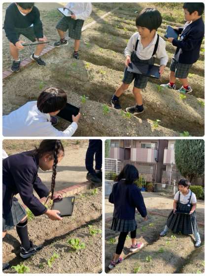 2年生は、この2学期に田辺大根の種を植えました。タブレット端末で撮影しながら、観察を続けています。間引きや雑草ぬきもがんばっています。