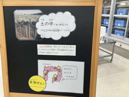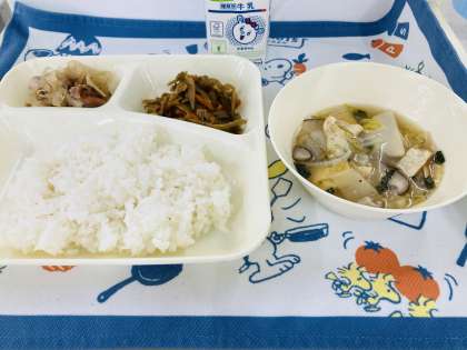 今日の献立は「鶏肉の梅風味焼き、うすくず汁、きんぴらごぼう、ごはん、牛乳」でした。ごぼうは、根の部分を主に食べる野菜の一つです。根が細くて、長い種類のものがよく食べられています。給食ではきんぴらごぼうやサラダ、煮ものとして登場します。おなかの調子を整える食物せんいを多く含んでいます。