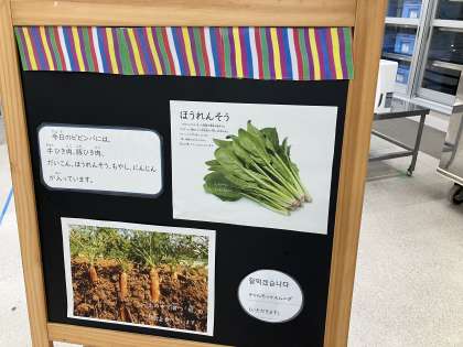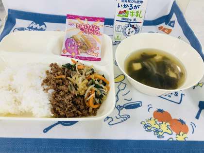 今日の献立は「ビビンバ、わかめスープ、いもけんぴフィッシュ、牛乳」でした。今日のビビンバは、だいこん、ほうれんそう、もやし、にんじんを使ったビビンバでした。