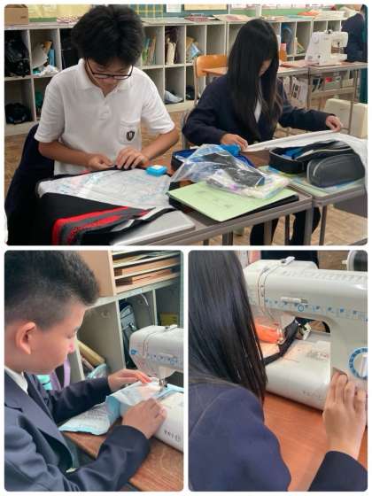 6年生は家庭科で、エプロンを作りました。布がずれないように折り、まち針でとめて縫いました。ミシンを使う際は、集中して少しずつ進めていきました。ひもを通し、完成させました。