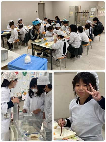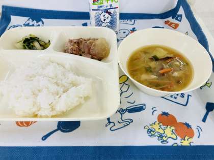 今日の献立は「豚肉のしょうが焼き、さつまいものみそ汁、きくなとはくさいのごまあえ、ごはん、牛乳」でした。