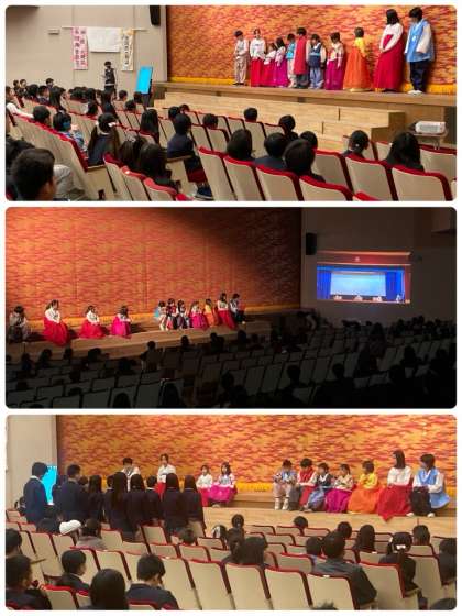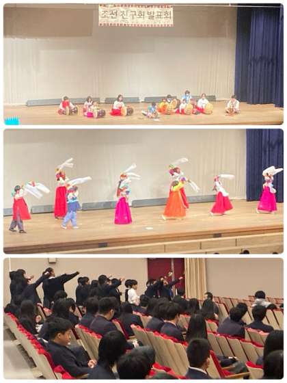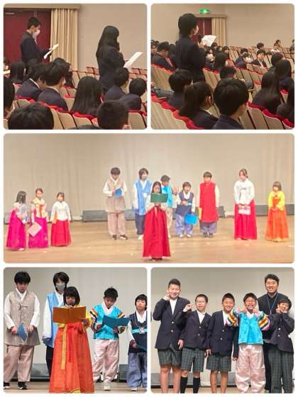 本日、チョソン友の会の発表会を行いました。ソンセンニム(民族講師)からお話をいただいたあと、各学年が応援メッセージや実践報告を伝えてくれました。あたたかい励ましの言葉に、友の会のみんなはすごくうれしそうでした。