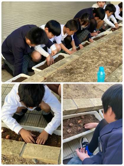 3年生は、中庭の外通路横にチューリップの球根を植えました。ひとつずつ思いをこめながら土をかぶせていきました。