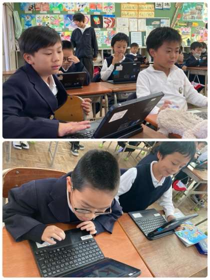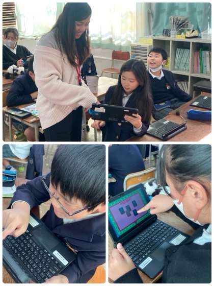 4年生は外国語活動で、タブレットを使ってオリジナル英語クイズを解きました。学習したことを思い出しながら、ひっかけ問題にも気をつけてのぞみました。