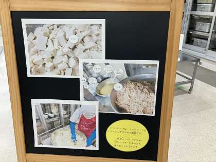 今日の献立は「とうふローフ、カリフラワーのスープ煮、りんご、コッペパン、ソフトマーガリン、牛乳」でした。とうふローフは、とうふ、ツナ、細かくカットした大豆、たまねぎを混ぜ合わせ、砂糖、塩、こいくちしょうゆで味つけし、焼き物機で焼いています。ミートローフをイメージして作られた献立です。卵が入っていないため、卵アレルギーのある人も食べることができます。ケチャップをつけていただきました。