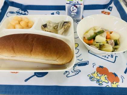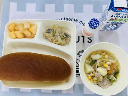 今日の献立は「あじのレモンマリネ、てぼ豆のスープ煮、白桃(カット缶)、中学校:発酵乳、黒糖パン、牛乳」でした。
