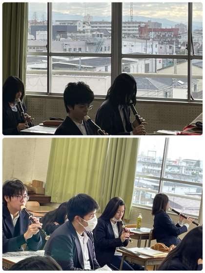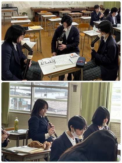 9年生は音楽の時間に、リコーダーによる合奏の練習に取り組んでいます。中学校で取り組んできたアルトリコーダーに、小学生で学んだソプラノリコーダー、加えて、珍しい、大きなバスリコーダーとそれぞれ違う楽器を担当し、有名な「ピタゴラスイッチ」のテーマ曲に取り組んでいます。