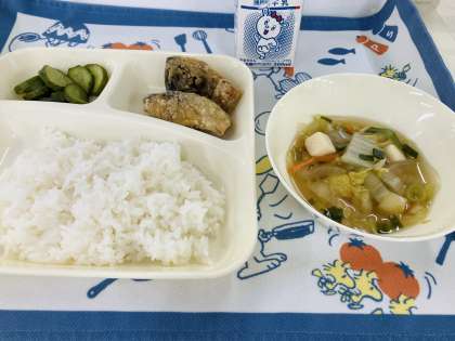 今日の献立は「さばのカレーたつたあげ、五目汁、きゅうりの甘酢あえ、ごはん、牛乳」でした。