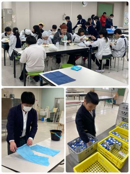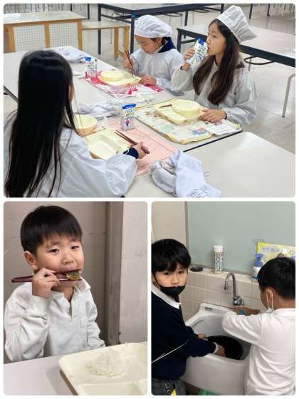 【さばのカレーたつたあげ】しょうが汁、料理酒、こいくちしょうゆ、カレー粉で下味をつけ、でん粉をまぶしてなたね油であげました。ボウルのふたをあけるとカレーの香りがふわっと広がり、児童生徒に好評でした。