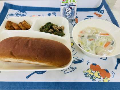 今日の献立は「はくさいのクリーム煮、あつあげのピり辛じょうゆかけ、豚肉とさんどまめのオイスターソースいため、黒糖パン、牛乳」でした。