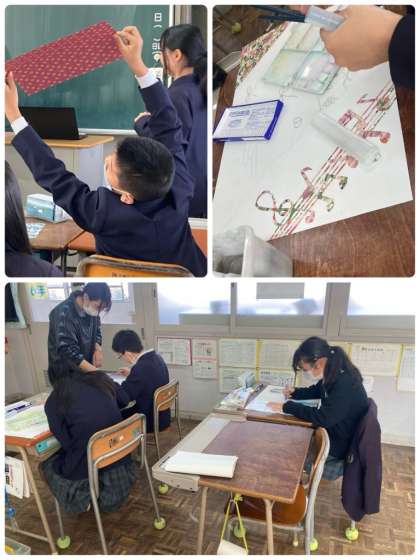 さすがという発想で形を組み合わせたり、和模様と連動する色合いを工夫したり、それぞれの個性が存分に発揮できています。どのような仕上がりになるのか、完成が楽しみです。