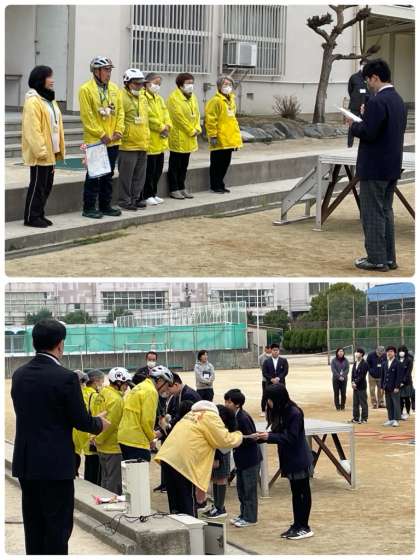 生徒会代表が感謝の気持ちを伝えたあと、6年生が児童の書いた手紙をお渡ししました。見守り隊の方からも、安全啓発へのお話をしていただき、子どもたちの意識もさらに高まったと思います。これからも、児童生徒が安全に登校できるよう、よろしくお願いいたします。