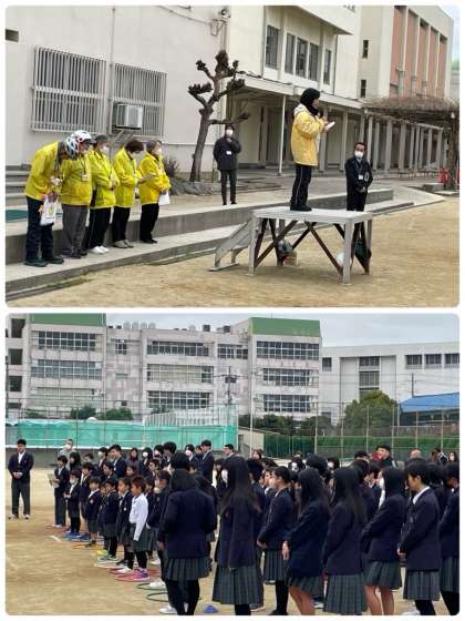 毎朝、児童生徒の登校をあたたかく見守ってくださっている地域の見守り隊の方々をお招きして、感謝を伝える全校朝会を行いました。