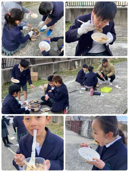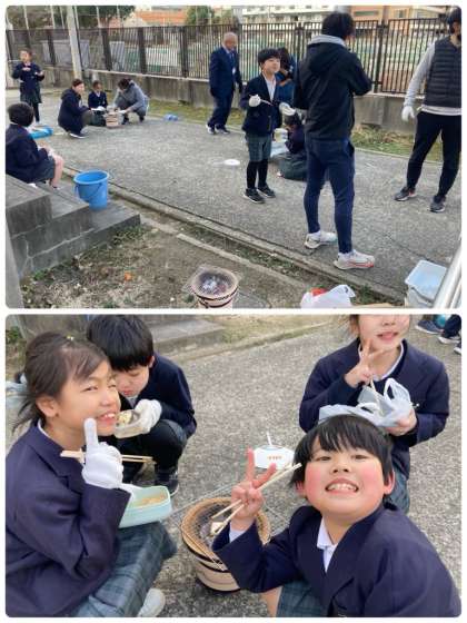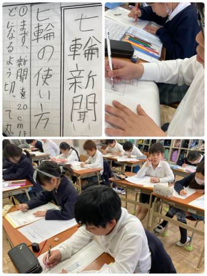 3年生は社会で、昔の道具について学習しています。七輪を使って、炭に火をつけていきました。うまく火がつかないことも経験しながら、炭の置き方や風の向きなども考え、協力して火をつけることができました。教室では、学んだことを新聞にまとめました。