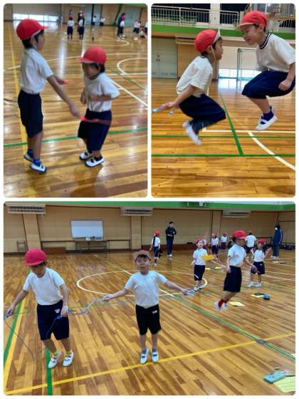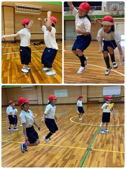 1年生は体育で、なわとびの2人ペアとびに挑戦しました。いろんな人とペアになりながら、タイミングを合わせて、声をかけてとんでいました。上達したペアがたくさんあります。