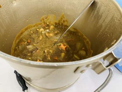 「鶏レバー」は鶏の肝臓の部分が原材料です。今日のチキンレバーカレーライスは、砂糖や塩、香辛料などで味つけされたペースト状の鶏レバーを使いました。しょうがやにんにく、セロリを香りよくいためることで、レバー特有のくせのあるにおいをおさえ食べやすくしました。